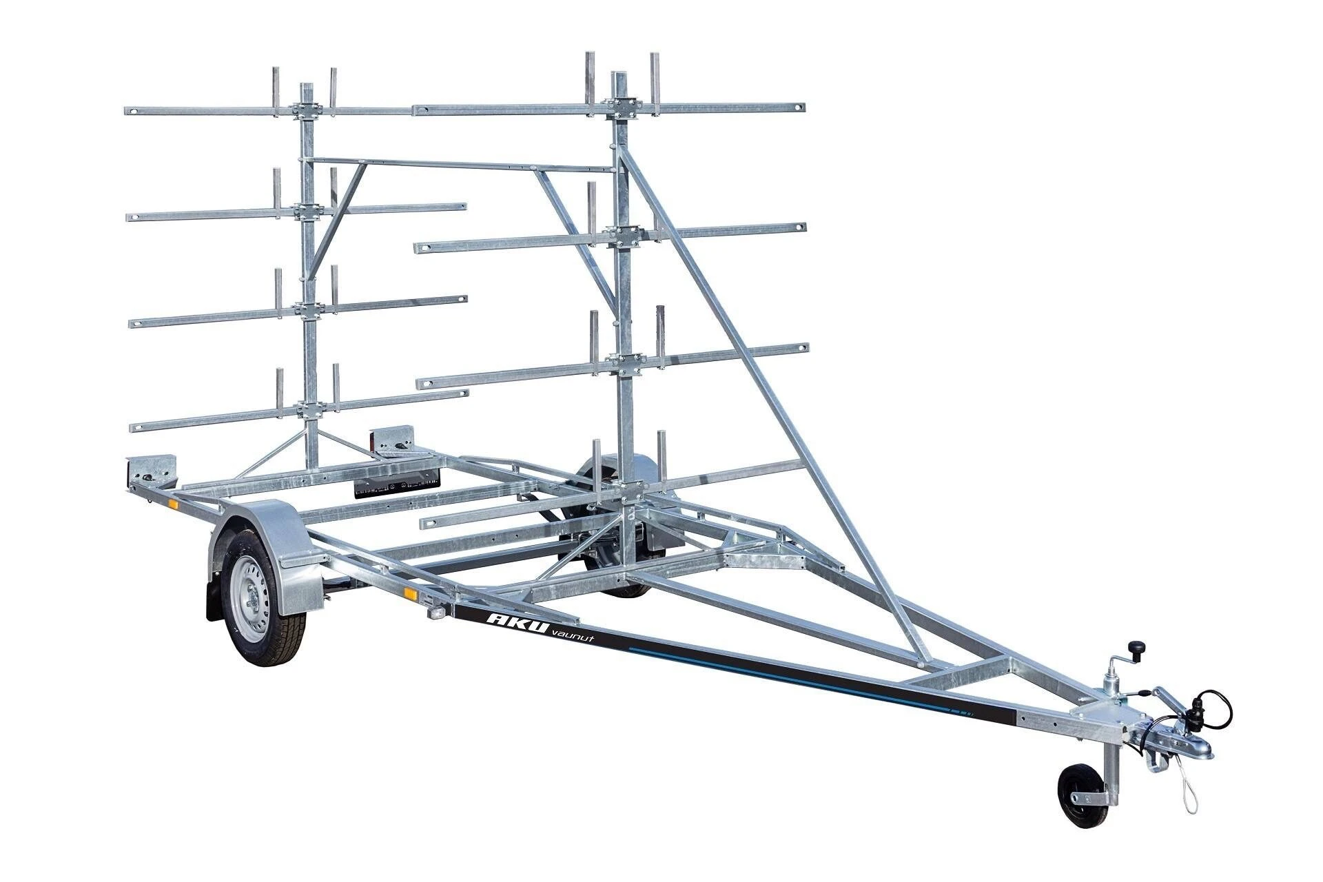 Kajakkitraileri ottaa 16 kajakkia tai 8 kanoottia, joten isommankin melontaporukan kuljetustarpeet onnistuu tällä hyvin. Trailerissa on tarvikelaatikko meloille, liiveille, aukkopeittteille ja muille välineille.